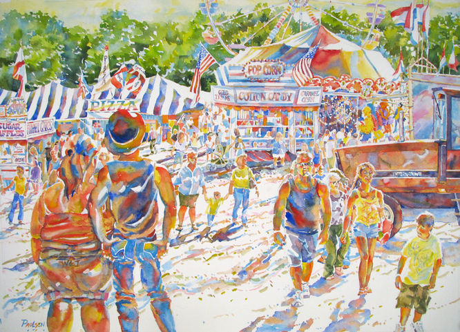 I have a never ending fascination with the county fair, and am also enchanted with bull riding, perhaps because I love a huge gnarly sweaty crowd scene with lots of color and motion. My husband and I have just moved from rural western Pennsylvania to somewhat coastal Virginia; my plan is to temporarily abandon painting county fair scenes and focus on the beach. The crowd is just as fascinating, and the water as backdrop is just stellar...all those warm skin tones against the blue! Stay tuned.